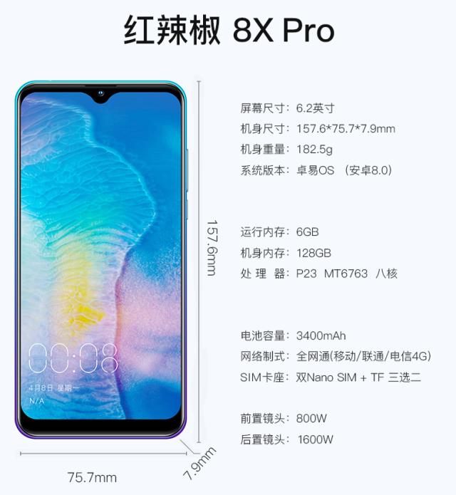 小辣椒8X pro 屏幕采用6.2英寸水滴屏,屏占比87.5%,低配4G+64G,高配6G+128G,CPU为8核Helio P23,主频达2.3Ghz,前800万像素美颜自拍摄像头,后1600万像素摄像头(Ai智能双摄快速对焦等功能),有指纹人脸双识别。